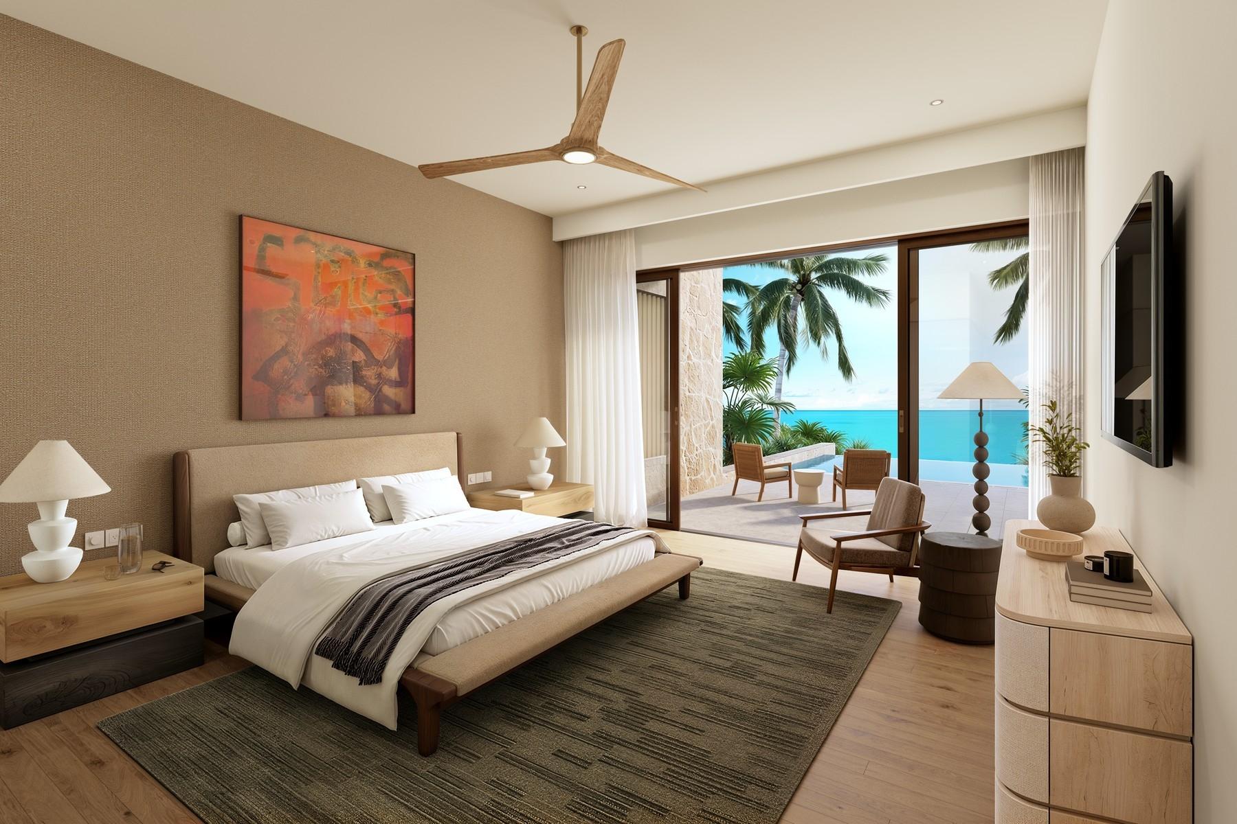 Elevated 40 feet above sea level, spanning 4,470 interior sq. ft. (6,055 sq. ft. under roof) plus 1,473 exterior sq. ft. for a total of 7,528 sq. ft. All five bedrooms offer private ensuites, including two primary suites with private terraces, walk-in closets, and spa bathrooms. The fifth bedroom is privately located in a courtyard casita with flexibility to convert to gym, playroom, or media room. The second level includes a bonus room overlooking the private courtyard with outdoor kitchen. Natural limestone flooring, hand-applied plaster, and coral stone finishes throughout. A 42-foot infinity pool overlooks 65 feet of Caicos Banks frontage, with dry beach, fire pit, lounging area, and oceanfront deck with ocean access.