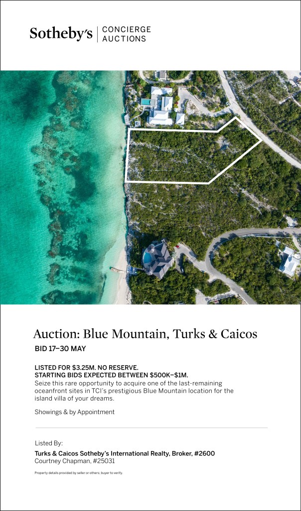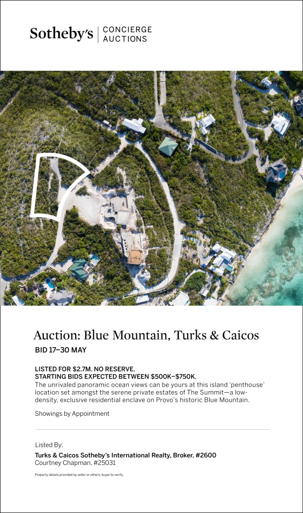 Turks & Caicos Sotheby’s International Realty is pleased to announce two spectacular Blue Mountain lots as part of the ‘Exceptional Global Properties’ offering marking the first time ever that a Turks & Caicos Islands property will gavel at Sotheby’s Auction. Through this exciting partnership with Sotheby’s Concierge Auction.