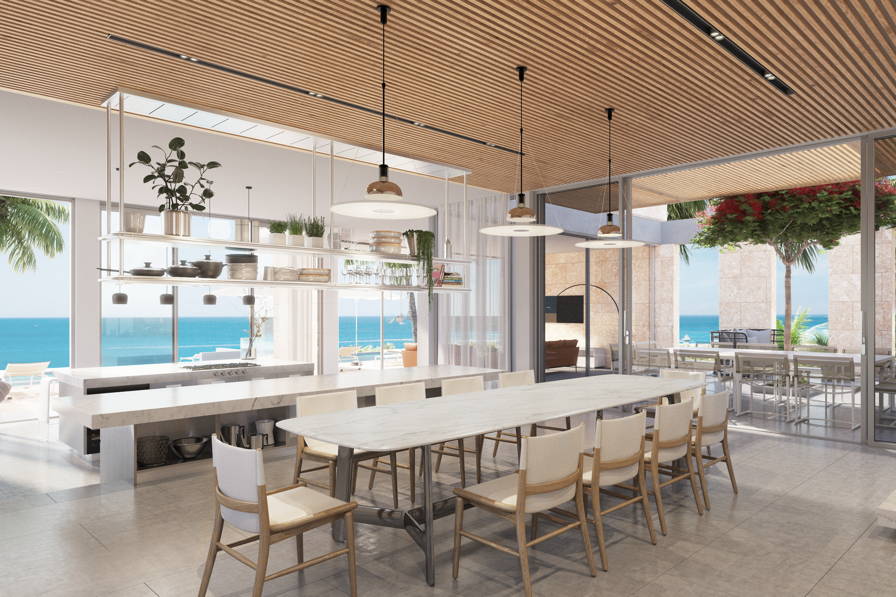The bespoke wet bar area off the great room, chefโs kitchen, screened outdoor dining and lounge terrace and ample indoor and outdoor lounge spaces afford a full array of entertainment possibilities. A signature illuminated onyx staircase leads up to the second level with its grand primary suite and second bedroom. The primary bathroom features dramatic black and cream quartz floor to ceiling. Jaw-dropping views abound from both levels through full height glass and top-of-the-line sliding glass doors.ย